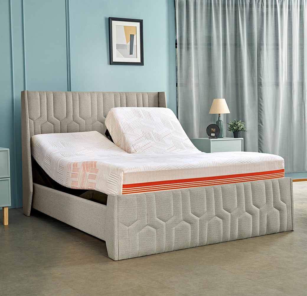 Wave Plus Adjustable Bed with Tranquil Sea Shell Upholstered Bed and Quboid Mattress